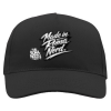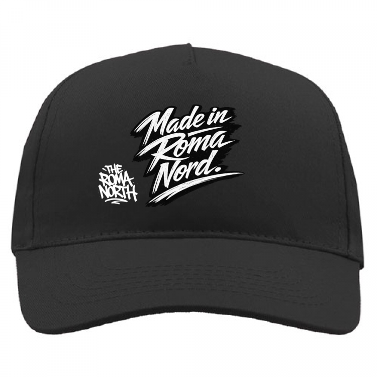 Cappello adulto a 5 pannelli. Visiera preformata con sandwich, 4 occhielli di ventilazione ricamati, chiusura posteriore regolabile con fibbia in metallo.